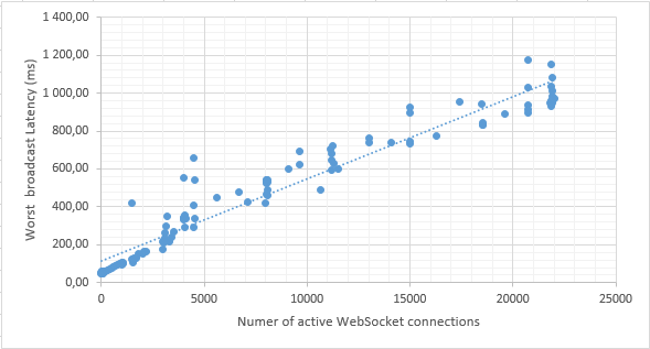 The JsonMessagesProtocol#sendCommand latency is practically independent of the number of connections and remains within 2-50ms., so our recommendation is to limit a JsonMessagesProtocol#broadcast usage if you expect more when 10000 concurrent WebSocket connections. Usage of JsonMessagesProtocol#sendCommand is not a bottleneck.